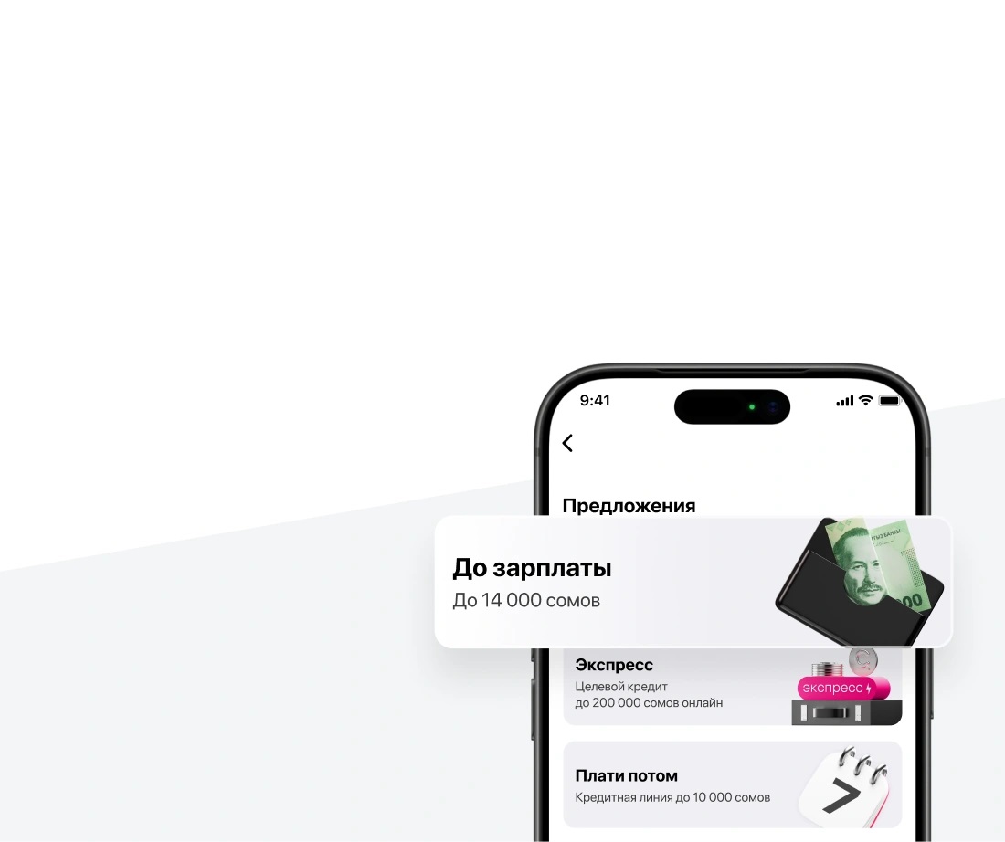 Кызмат 10 000 сомго чейин 7 күнгө пайызсыз, комиссиясыз жана үйдөн чыкпай туруп кредит алууга мүмкүндүк берет. Алынган сумманы «Кийин төлө» боюнча өнөктөштөр тармагында товарларга жана кызмат көрсөтүүлөргө төлөө үчүн колдонсо болот.